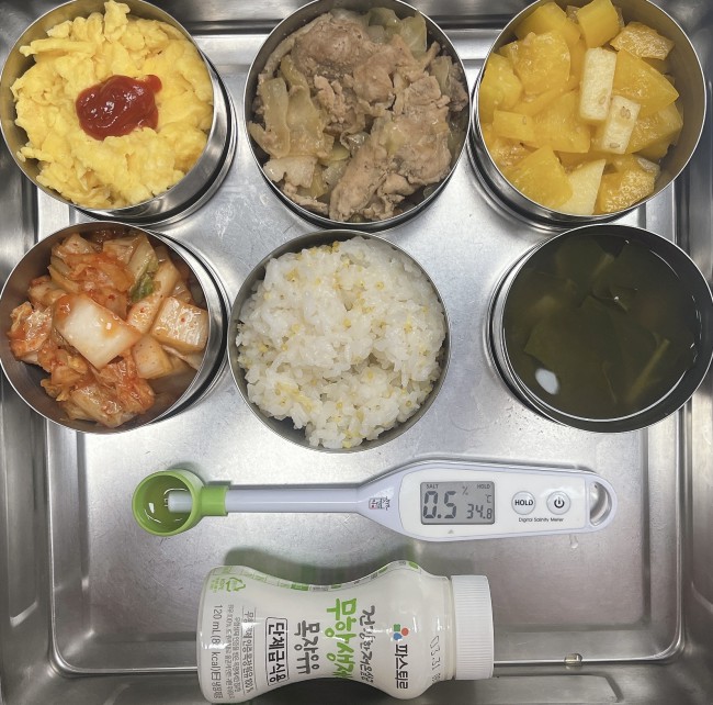 5세: 기장밥, 근대장국, 제육볶음, 스크램블에그*케찹, 파프리카된장무침, 백김치