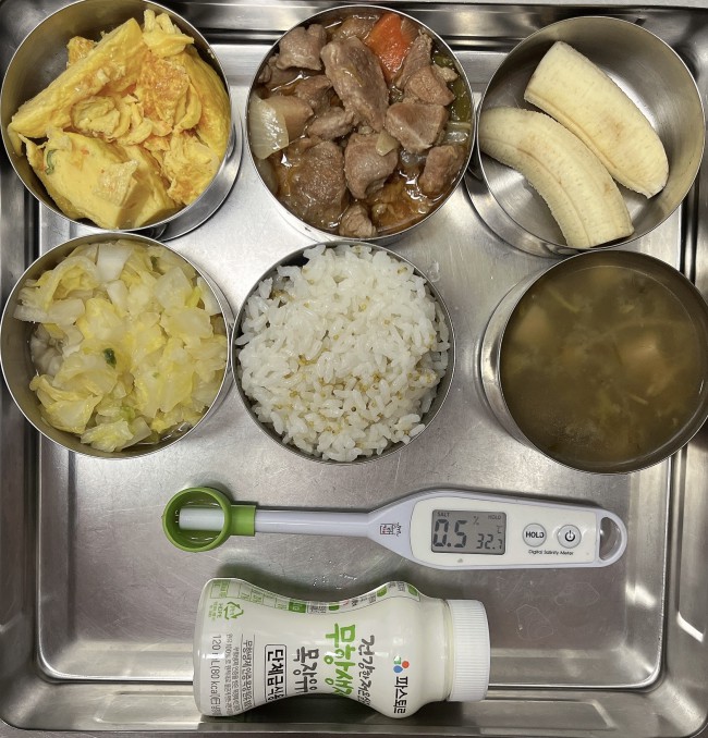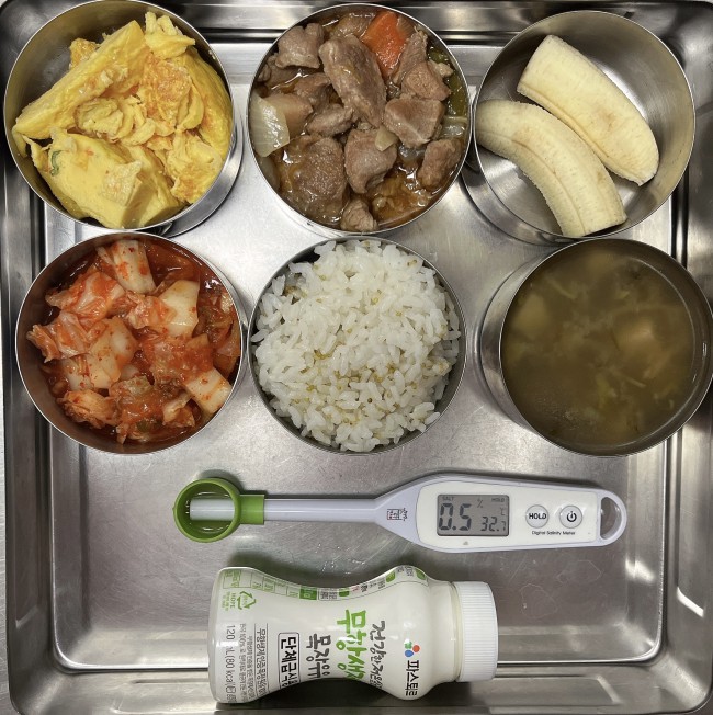 3.9.(월) 작성자 영양교사 작성일 2026-03-09 | 조회 69 | 본문 점심 식단 : 차조밥, 냉이들깨된장국, 목살바베큐볶음, 채소계란말이, 과일(바나나), 배추김치(7-6세)/백김치(5세)축산물 이력번호 : 돼지고기(국내산)_L12602123036006종일반 간식 : 꿀떡, 옥수수수염차 작성자 : 로그인을 하셔야 작성가능합니다.